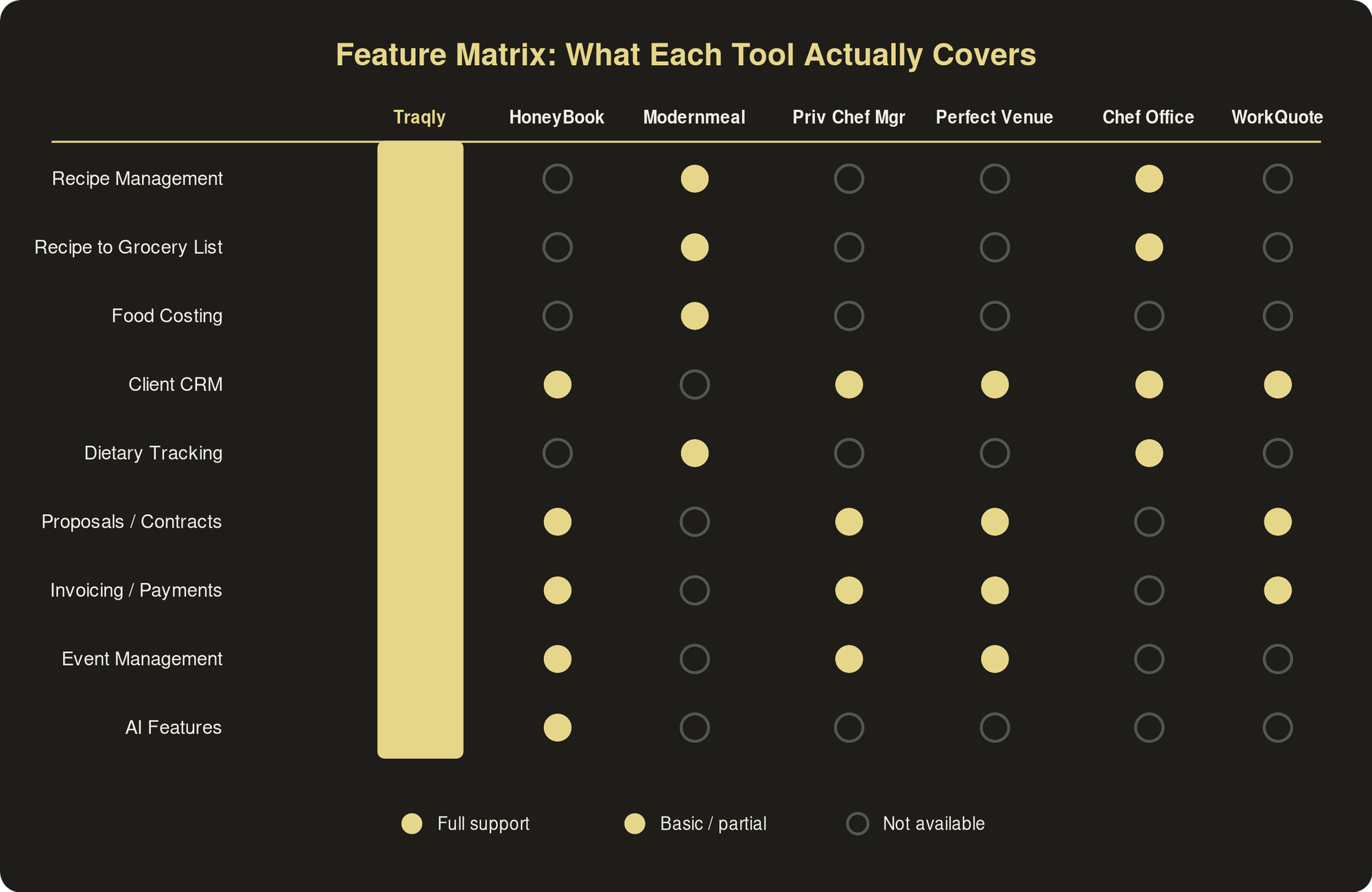 The honest take: If your business is 80%+ events and dinner parties, Perfect Venue is worth a look. The event proposal workflow is strong and the BEO management is something most other tools lack. But it's fundamentally an event tool. There's no recipe management, no grocery lists, no meal prep workflow. If you do weekly meal prep for recurring clients AND events, you'd need Perfect Venue plus a recipe tool plus a separate CRM. That's a lot of tabs. No AI copilot. You're building every proposal and every BEO from scratch each time.