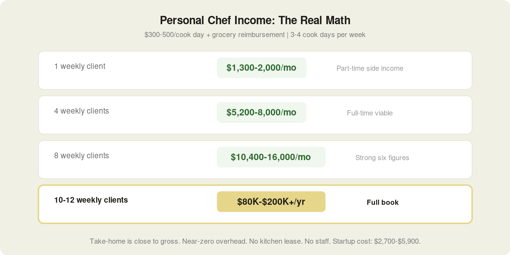 Most personal chefs work 3-4 cook days per week. The other days go to menu planning, grocery shopping, client communication, proposals, and admin. The overhead is almost zero: no commercial kitchen, no staff, no delivery logistics. Startup costs run $2,700-$5,900. Your main expenses are gas, insurance, and your time.