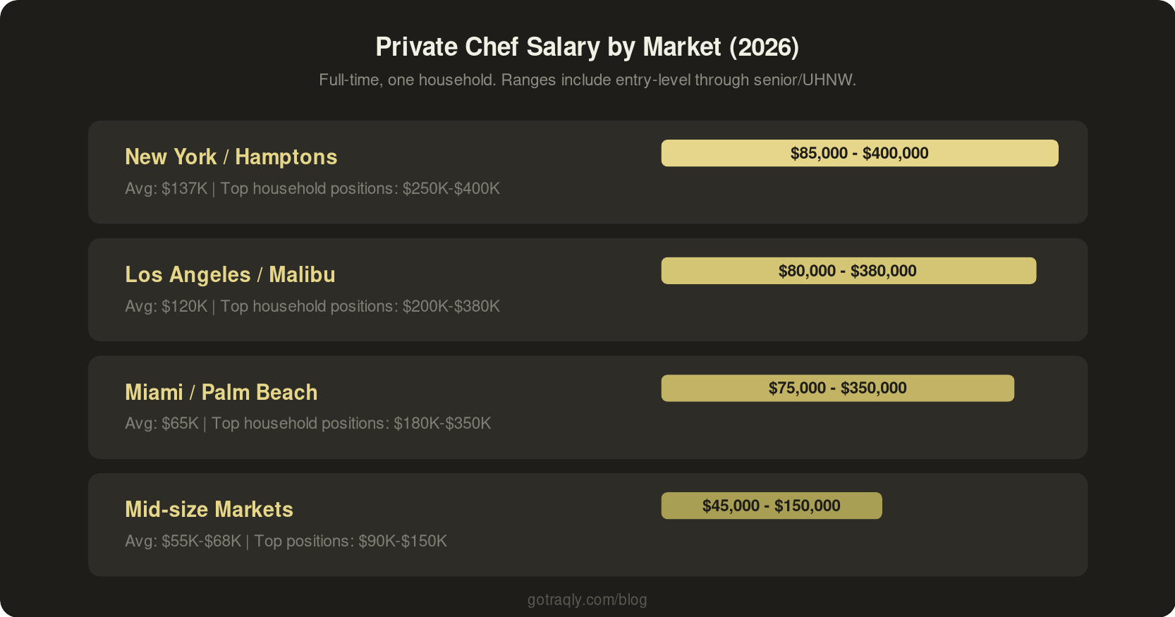 Those top numbers aren't outliers. A private chef for a high-net-worth family in the Hamptons who travels with them, manages their dietary protocols, and cooks three meals a day is doing specialized, high-trust work. The compensation reflects that.