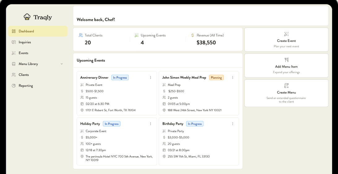 Traqly is launching its beta soon. If you’re a personal chef, caterer, or believe you could benefit, we’d love to hear from you. Either send us an email at support@gotraqly.com or sign up for our waitlist at gotraqly.com.